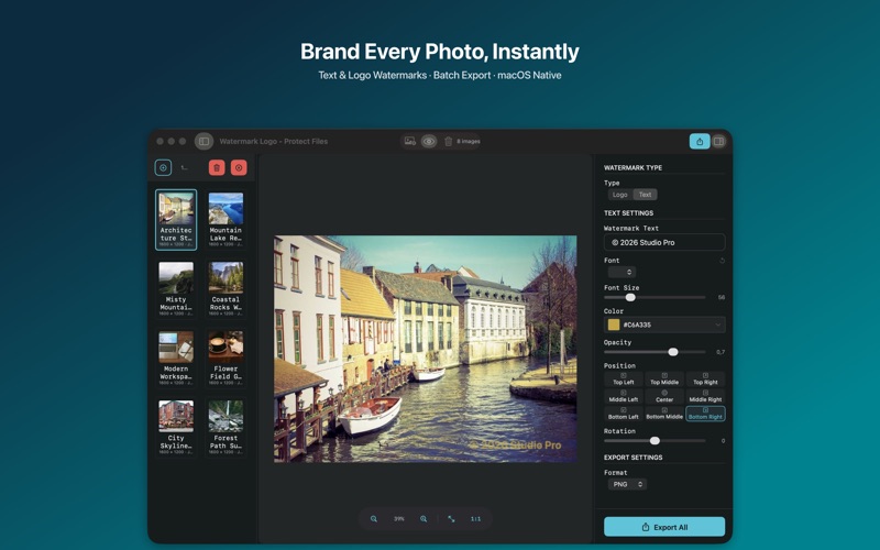 Your photos deserve your name on them. Watermark Logo makes it effortless — drag your logo onto any image, adjust it live, and batch-export hundreds in one click. The fastest way to brand and protect your creative work on macOS.