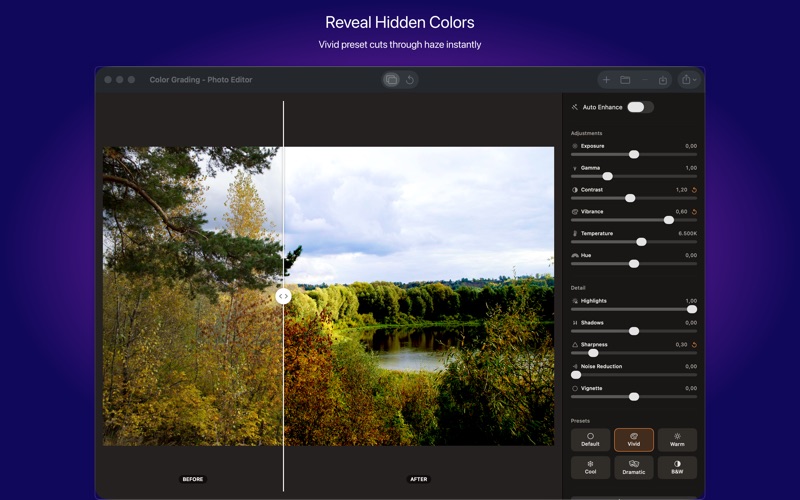 Turn any photo into a color-graded image with one click — choose from six presets (Vivid, Warm, Cool, Dramatic, B&W, Default) or adjust 11 sliders for a custom look. One-time purchase, no subscription required. Color Grading - Photo Editor delivers instant preview so you see every change the moment you make it.