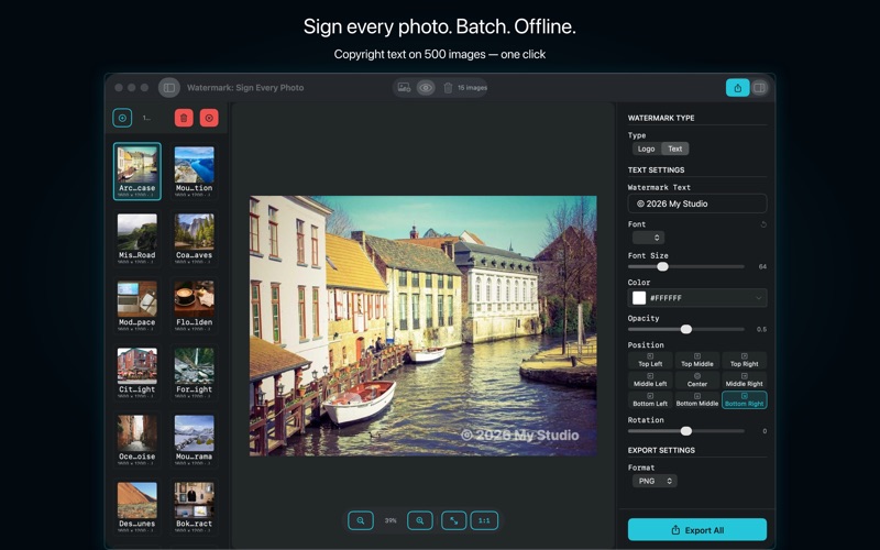 Drop any PNG, JPEG, or HEIC logo file into the inspector and it overlays all imported images at configurable opacity (0–100%) and scale (10–80% of source width). Nine named positions — top-left through bottom-right — anchor your logo to the same spot across every photo, ensuring visual consistency across a client gallery or product catalog.