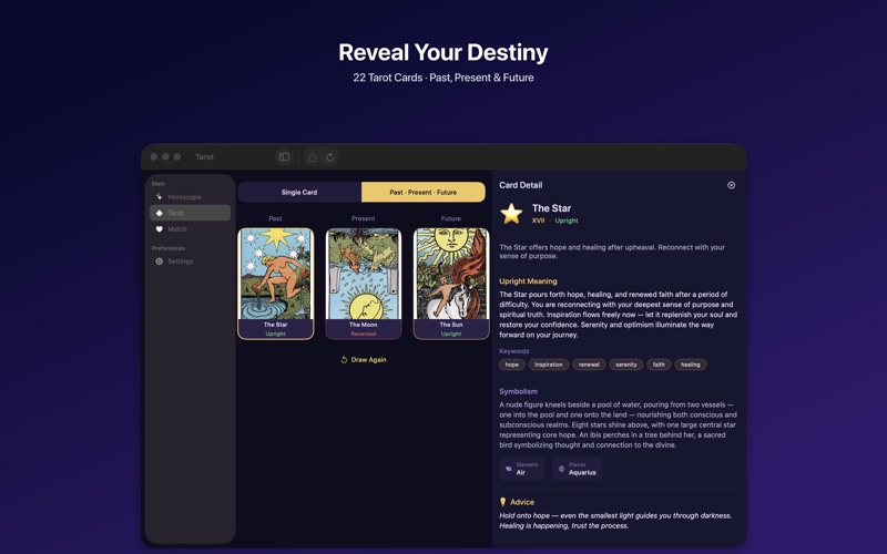 Horoscope Tab brings astrology, tarot, and zodiac compatibility together in a beautifully crafted macOS app. Access it instantly from the menu bar for quick readings, or open the full windowed app for deeper exploration.