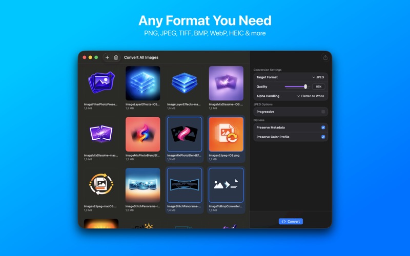 Fine-tune compression settings for JPEG, HEIC, and WebP. Choose lossless PNG or TIFF for maximum quality. Adjust output dimensions when needed.